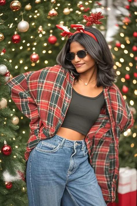 A beautiful woman with a perfectly sculpted hourglass figure stands poised before a towering, beautifully lit Christmas tree in ...