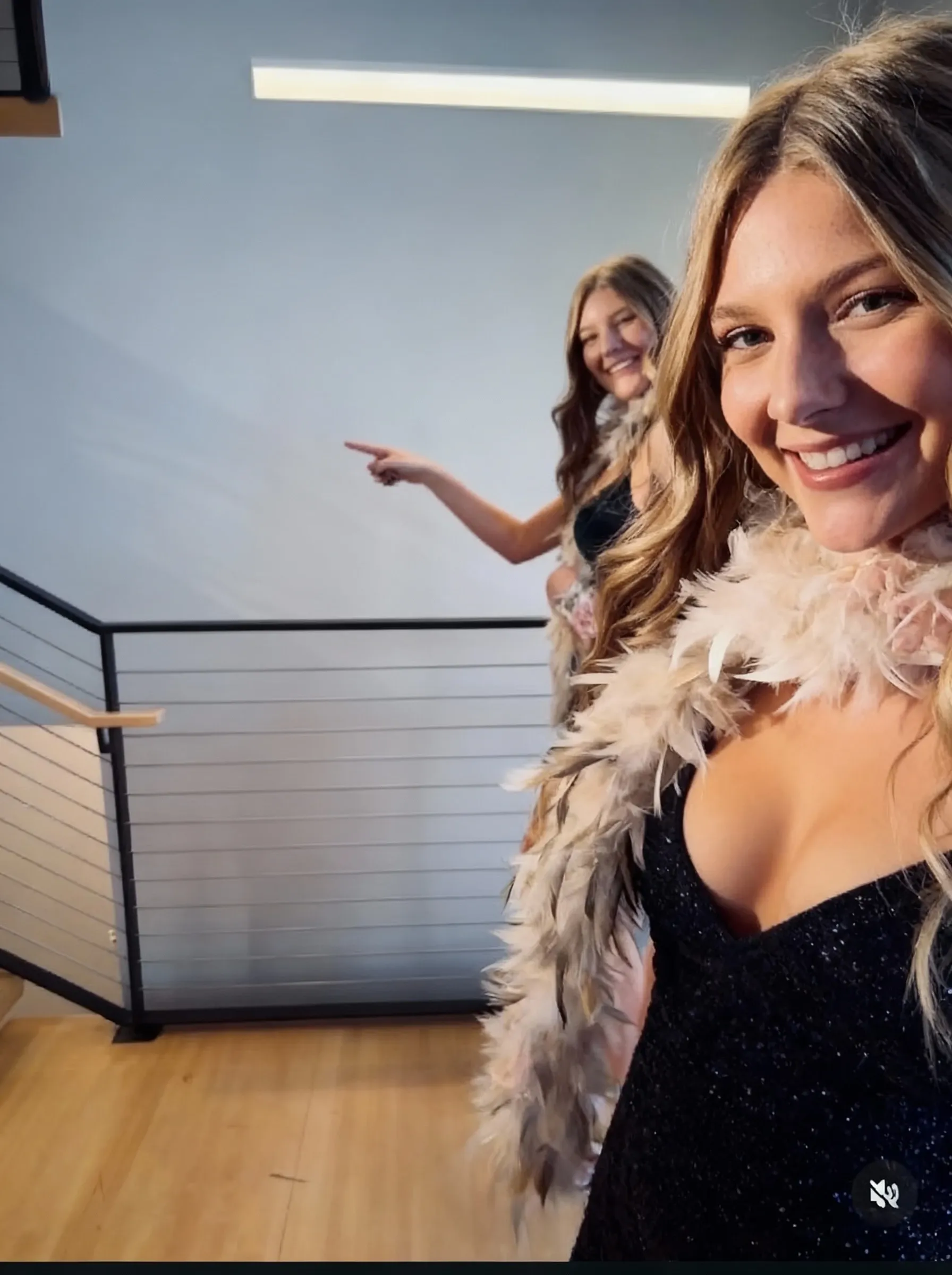 A woman poses confidently in a fitted black ribbed dress with a high collar, gently touching her neckline. She has long, sleek h...