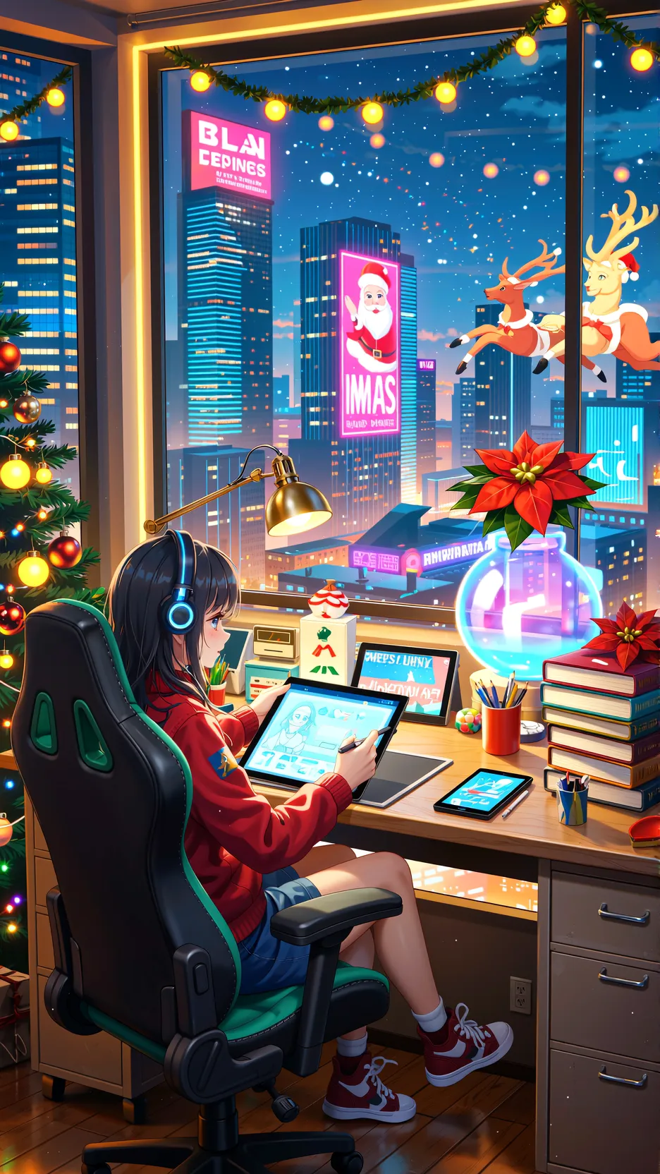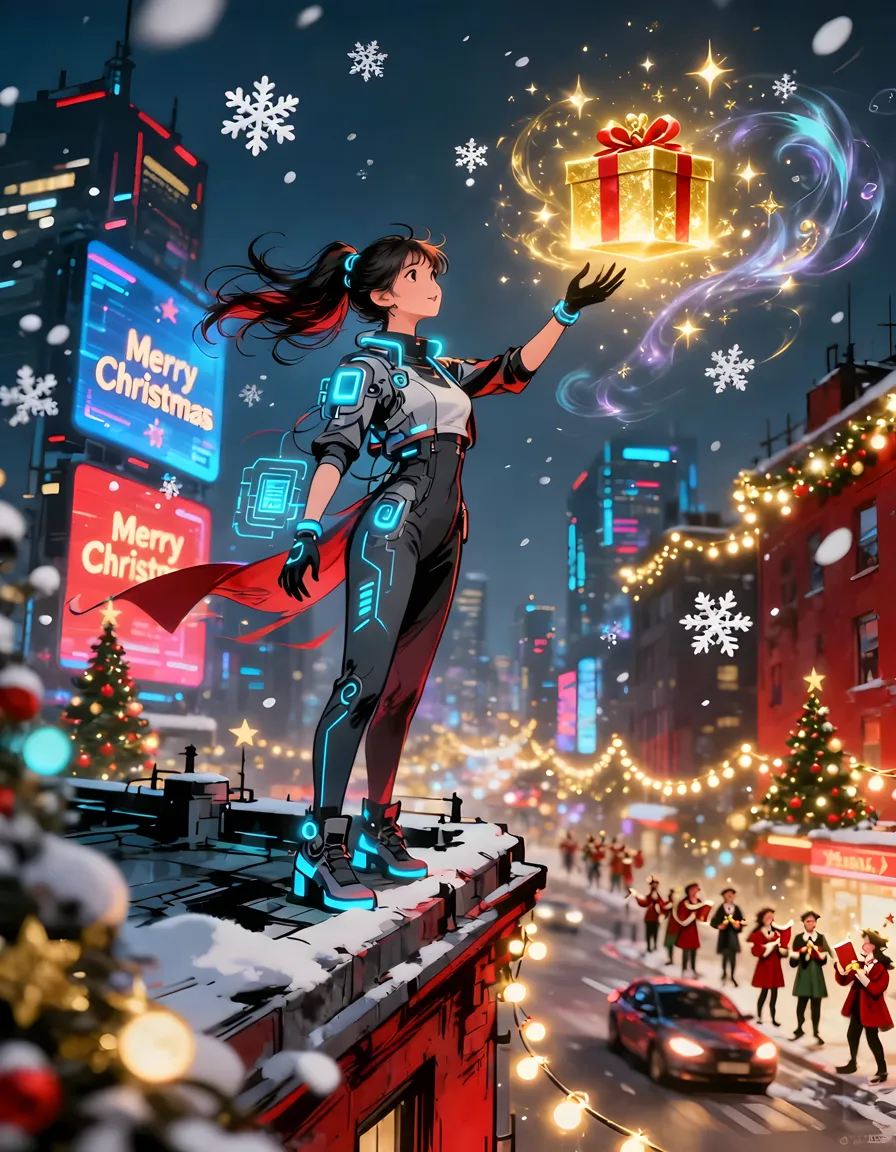 A heart-pounding action shot of the space courier leaping between neon-soaked buildings, with her distinctive courier knapsack n...