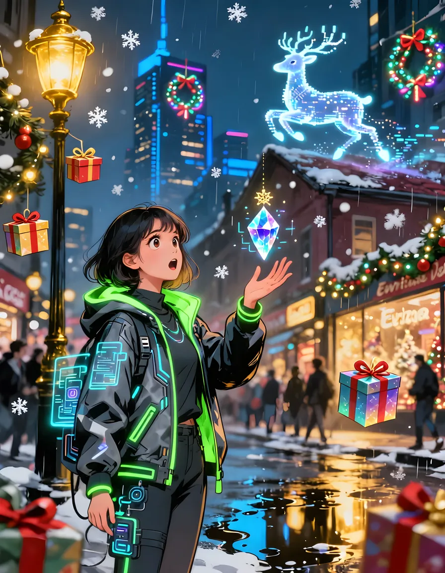 Android 18 from Dragon Ball, sitting legs crossed on giant gift box, sarcastic smile, wearing oversized red Christmas sweater of...