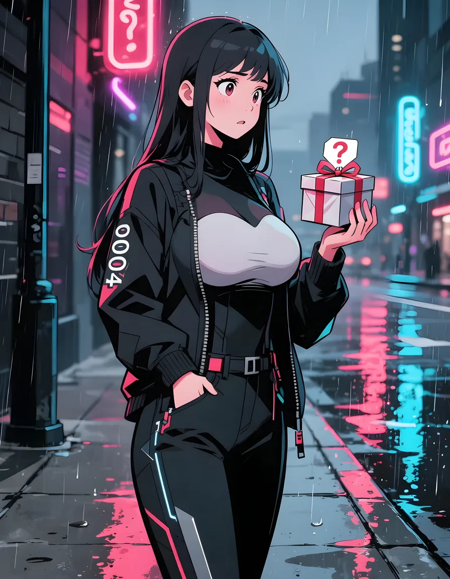 Girl, navy blue and hot pink gradient hair, light purple eyes, long hair, navy blue cyberpunk outfit, futuristic, floating, hold...