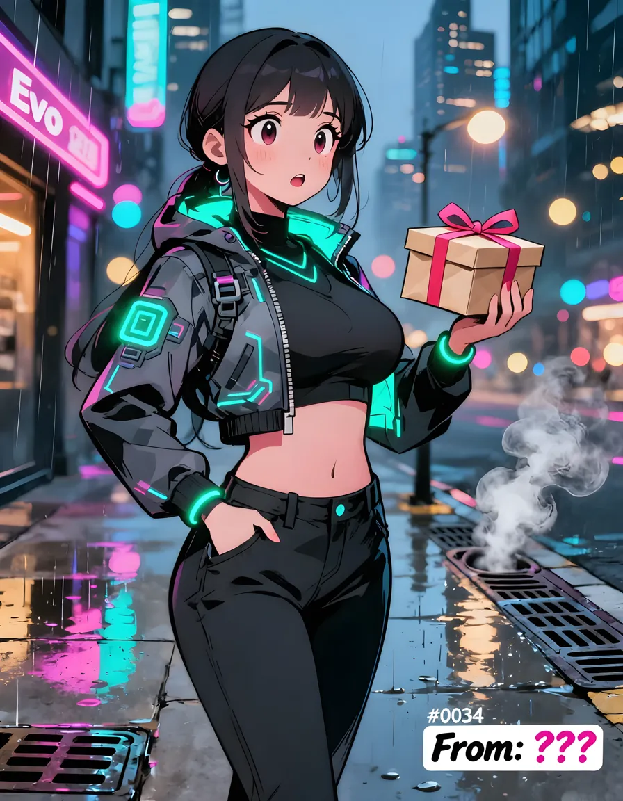 Android 18 from Dragon Ball, sitting legs crossed on giant gift box, sarcastic smile, wearing oversized red Christmas sweater of...