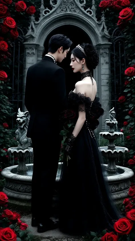 a couple, composed of a vampire, whose blonde hair falls softly down her back, He is facing away from his partner, dressed in a ...