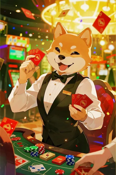 A realistic Shiba Inu performing fortune-telling. It wears a golden crown and a red cloak. In a dimly lit setting, the Shiba Inu...