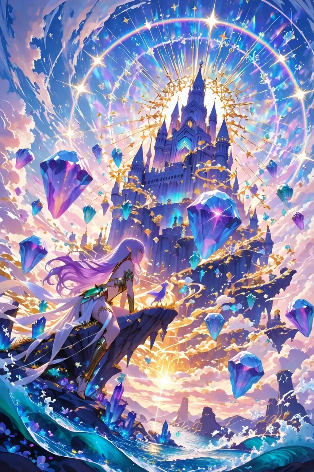 Spectacular Fantasy Scenery、Ancient Ruins、Rainbow-colored light source、atmospheric perspective、Crystal Sparkle、Mysterious Atmosp...