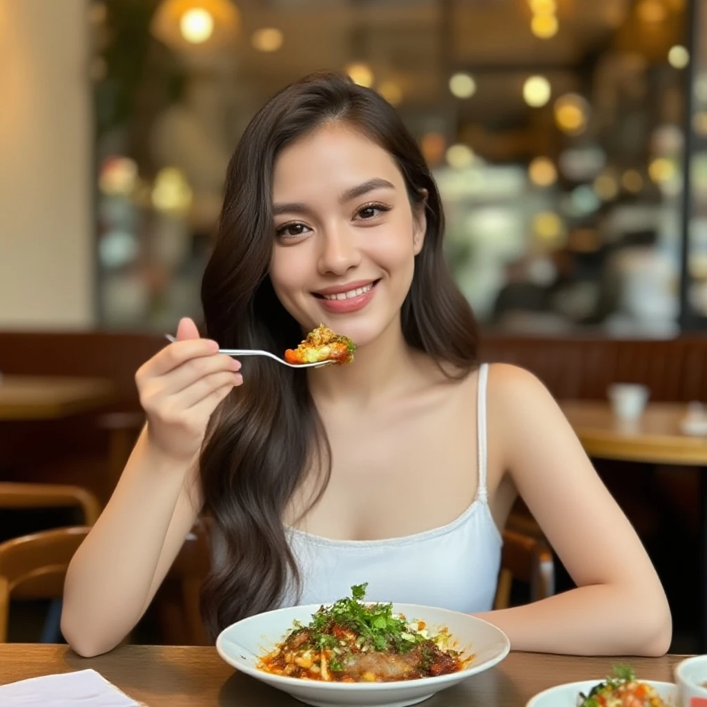 A Young Woman, Happy Laughter,sitting at the table,There are many delicacies on the table,realistic photo