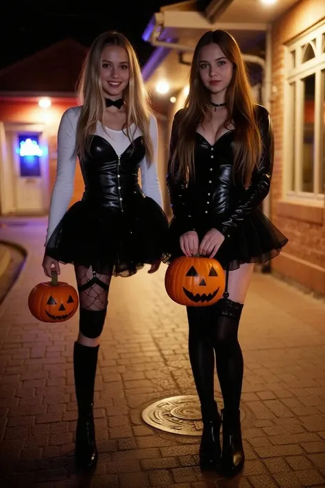 Two East-Asian girls in ornate dark navy sailor uniforms stand beneath glowing Halloween lanterns in a dimly lit corridor. Their...