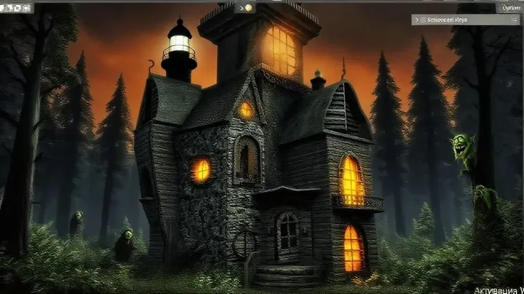 (Photorealism: 16:9), Halloween Horror Night, the castle in the middle, The house is decorated with light strips around the oute...