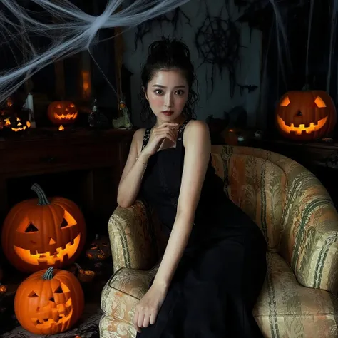 ,shengdanjie,1girl,bat (animal),solo,black hair,jack-o-lantern,long hair,pumpkin,halloween,looking at viewer,(Halloween poster w...