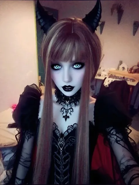 a sexy demon with blue hair, black horns, wearing black lace and leather, tattoo full body,, lot of ring on hand, holding a buck...
