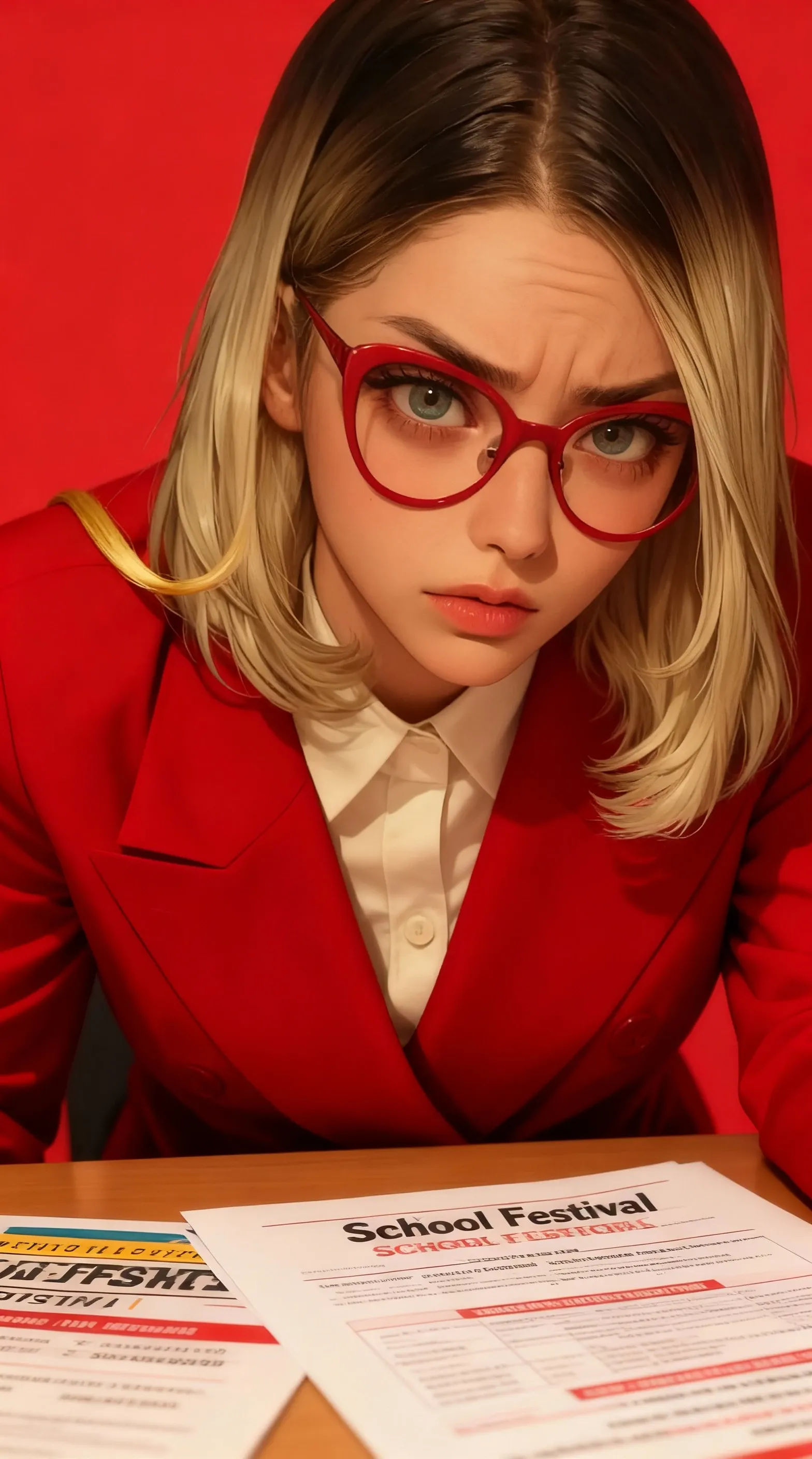 1 a girl with very short curly yellow hair,bright pink eyes, linda, cute black dress, lenses with red frame, fair skin, black be...