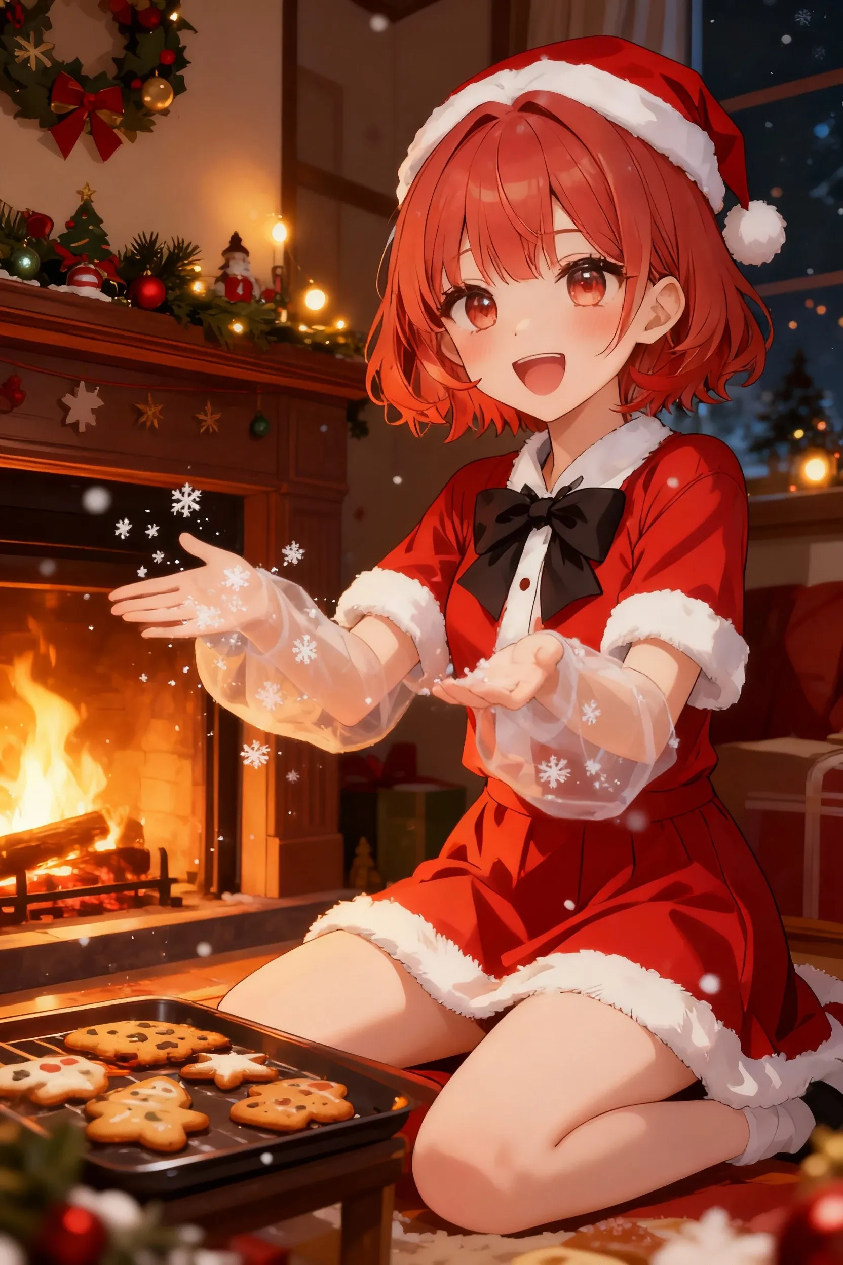 A highly detailed and vibrant 8K anime-style image of a cute girl dressed as Santa Claus in a cozy, festive room decorated for C...