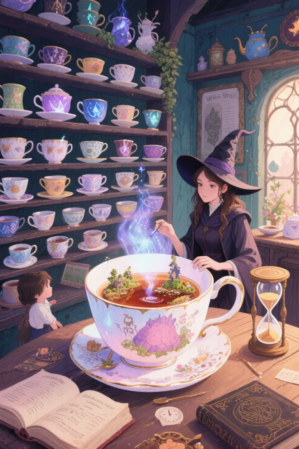 masterpiece,anime style,Beautiful girl,Mysterious Elixir Merchant、medieval fantasy、Old Wooden Stalls with Magical Potions、Mr.々Sm...