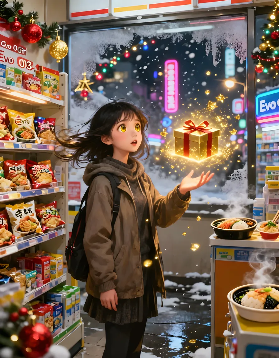 A stunning, realistic female shopaholic rushing through a bustling Christmas city street during the holiday season. Light, delic...