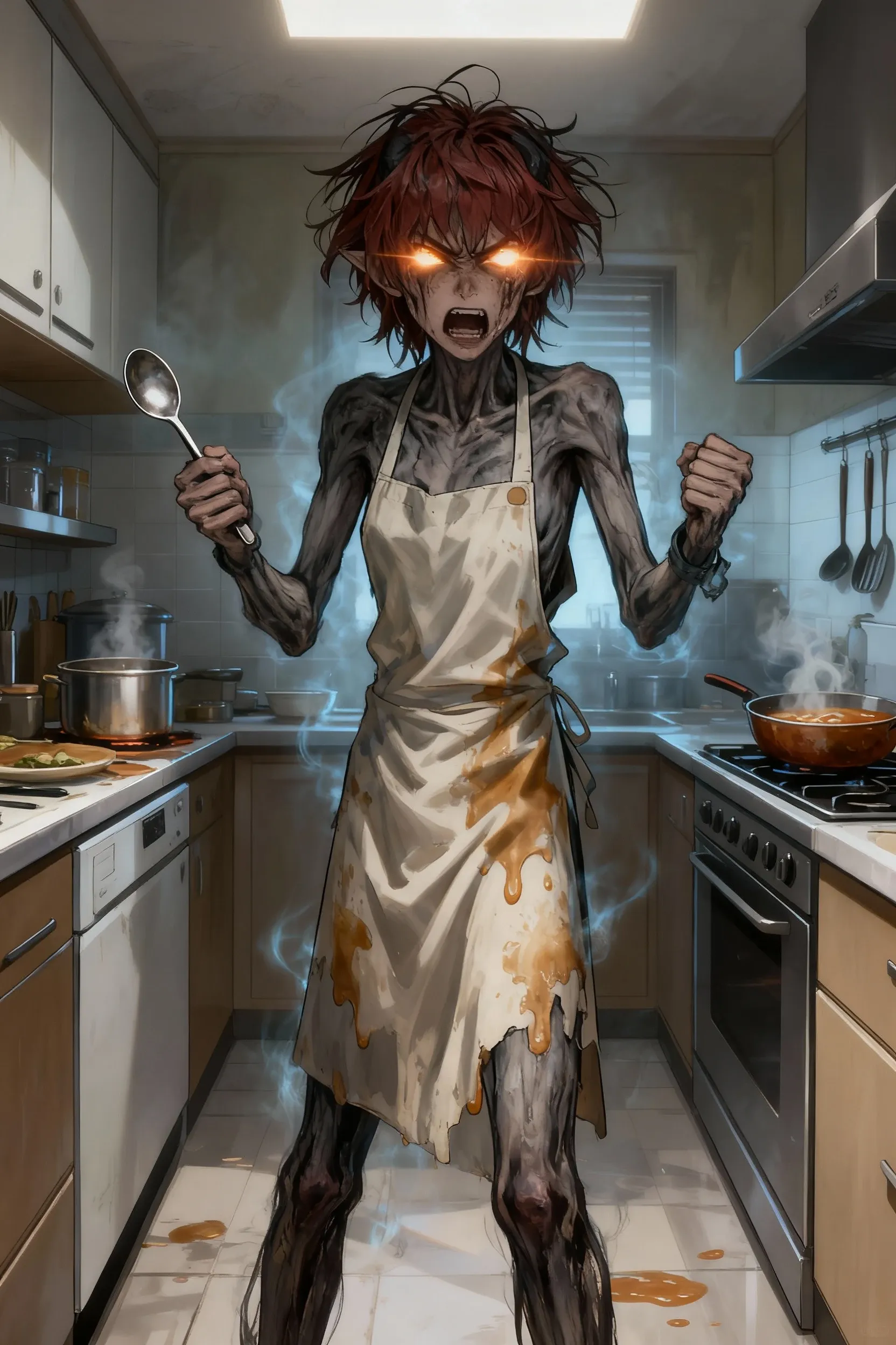 In a chaotic kitchen, a bizarre demon emerges from a glowing, swirling portal formed by a disastrous cooking accident. The demon...