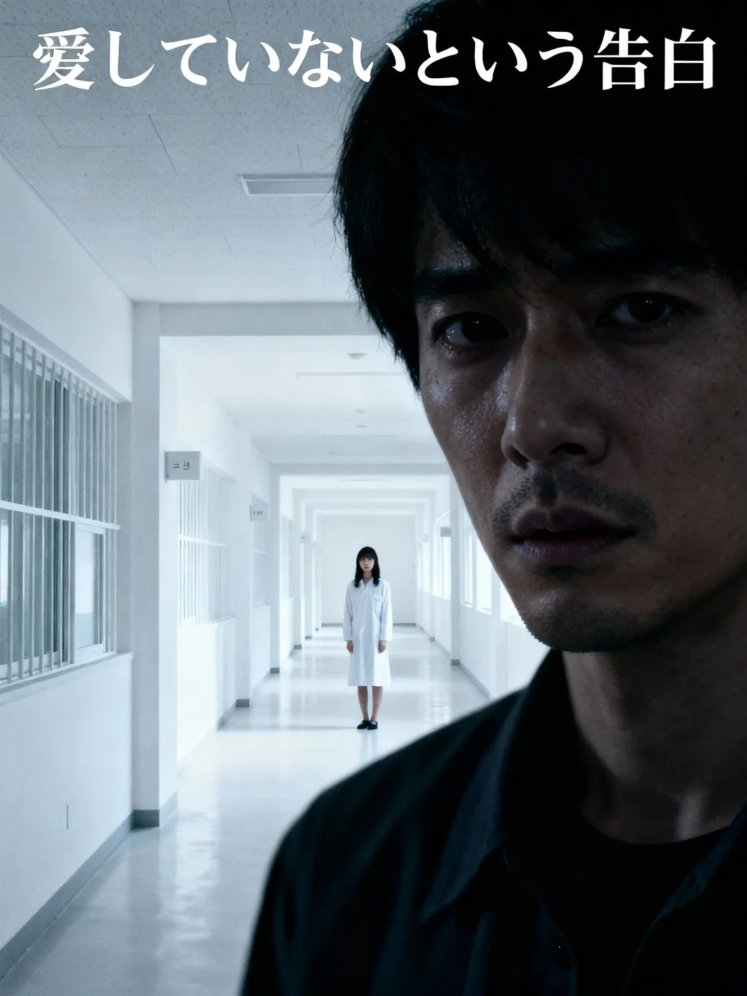 A rainy night at Shinjuku public hospital, a grim gray building with wet windows reflecting flickering fluorescent lights. Aiko,...