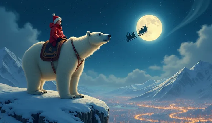 Santa’s sleigh soaring through glowing clouds at night, moonlight shining through, reindeer silhouettes outlined by stars, fairi...