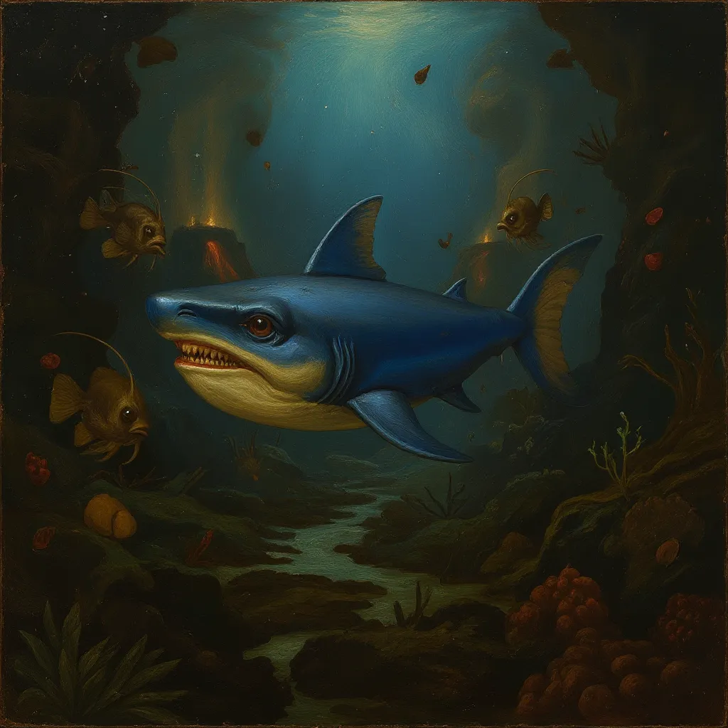 Surrealist painting style, a great white shark wearing polished black dress shoes, floating mid-air in a dreamlike blue void, hy...