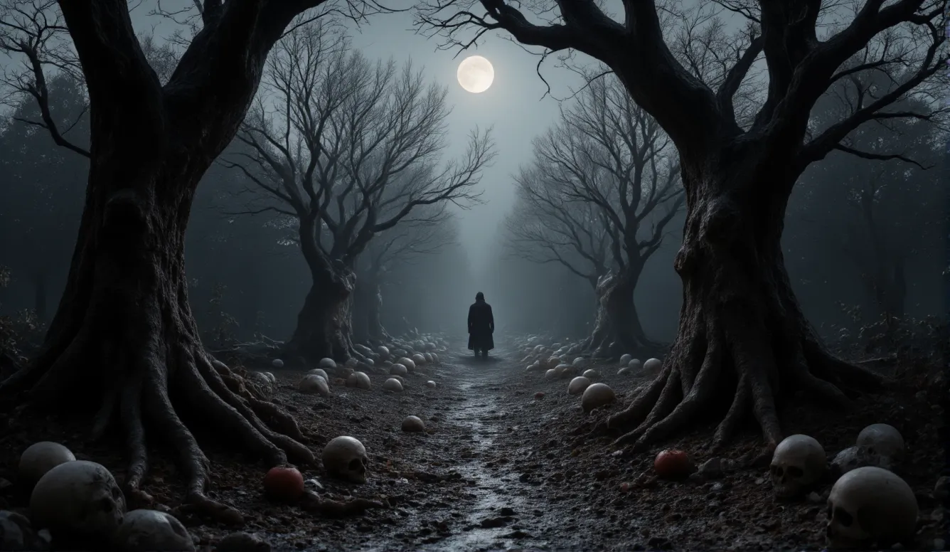 16:9 ultra-realistic 3D render wide shot of a dark forest path lined with dozens of glowing carved turnip lanterns on the left a...