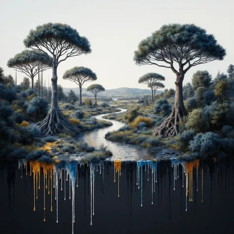 surreal and abstract painting of a desolate botanical garden with strangely shaped bushes and magical water fountains, classic a...