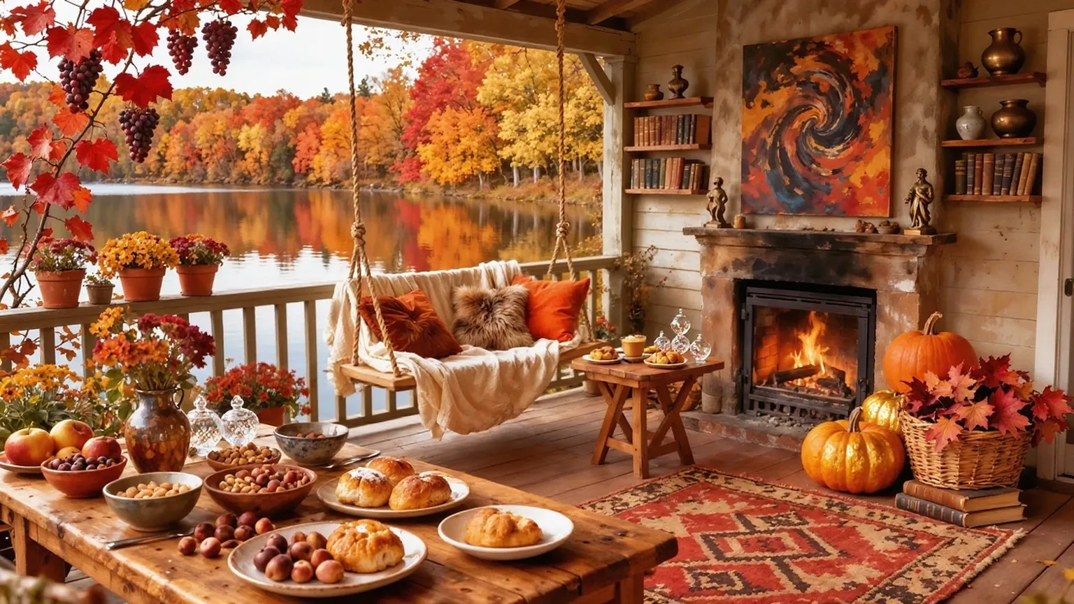 An ultra-realistic rustic autumn cabin exterior, glowing with warm golden-orange light from lanterns, and a flickering outdoor...